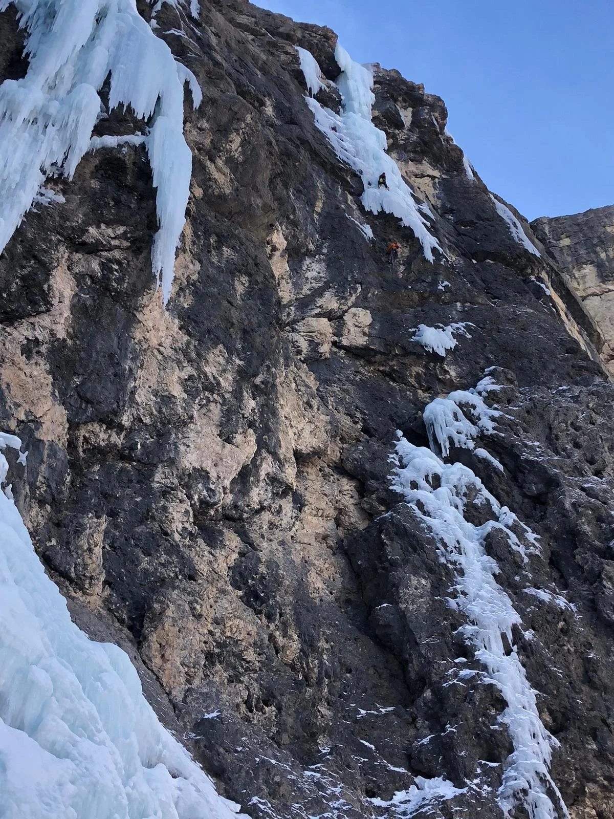 Bolted limestone choss with a fun transition onto an ice blob/roof, followed by more choss wrangling. At least it was bolted! Despite the bolts, this was less “in my wheelhouse” because of the physicality of the moves and the need to commit to less-than-secure placements in poor rock. Falling felt way more likely than on pitch 1, though the consequences would be much less.